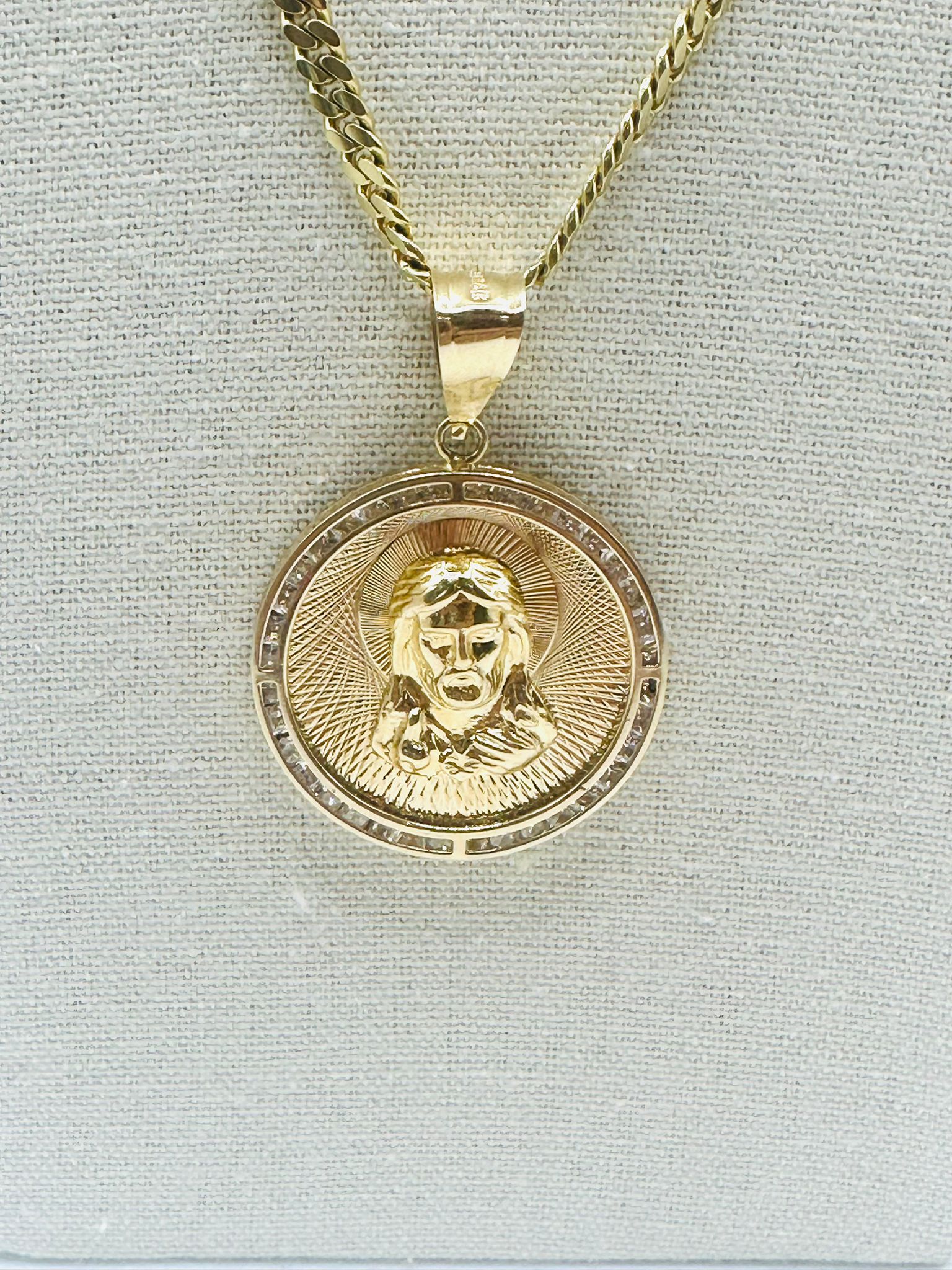 Cuban Link Chain with Jesus Medal Pendant in 14K Gold
