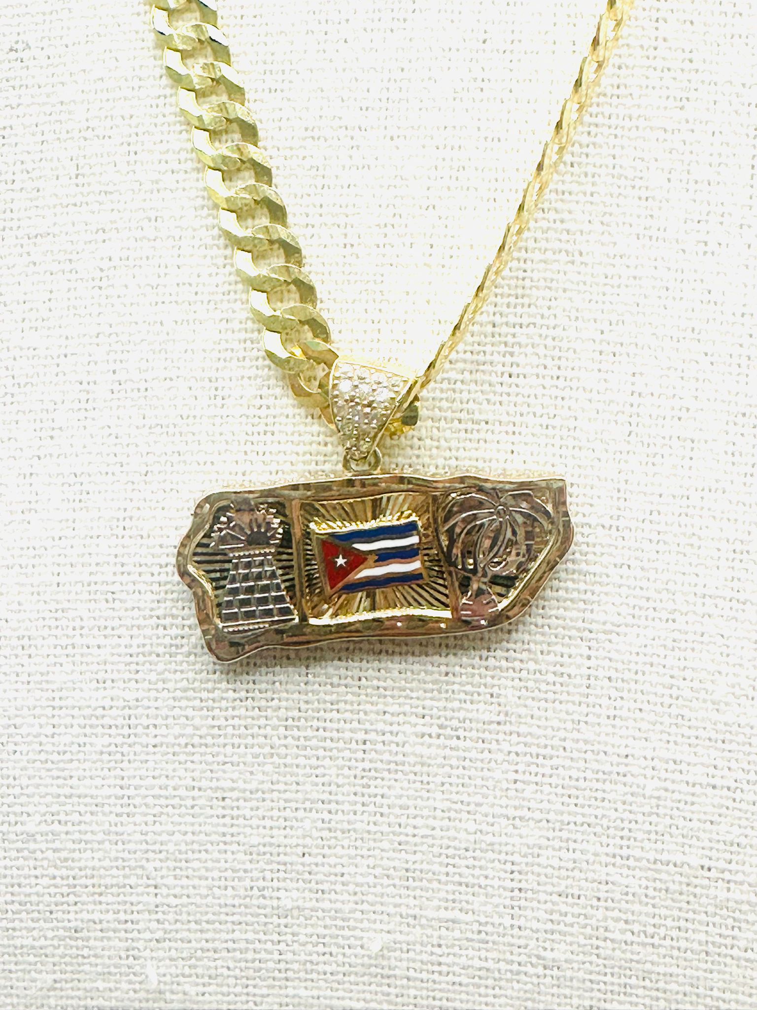 This 10K gold Bright Cut Chain features a finely detailed Cuban flag pendant, showcasing precise craftsmanship and timeless design. The bright cut finish enhances the chain's reflective qualities, offering a sophisticated sparkle that complements the pendant's vibrant symbolism. Ideal for those who appreciate quality jewelry with cultural significance, this piece combines durability with elegant style.