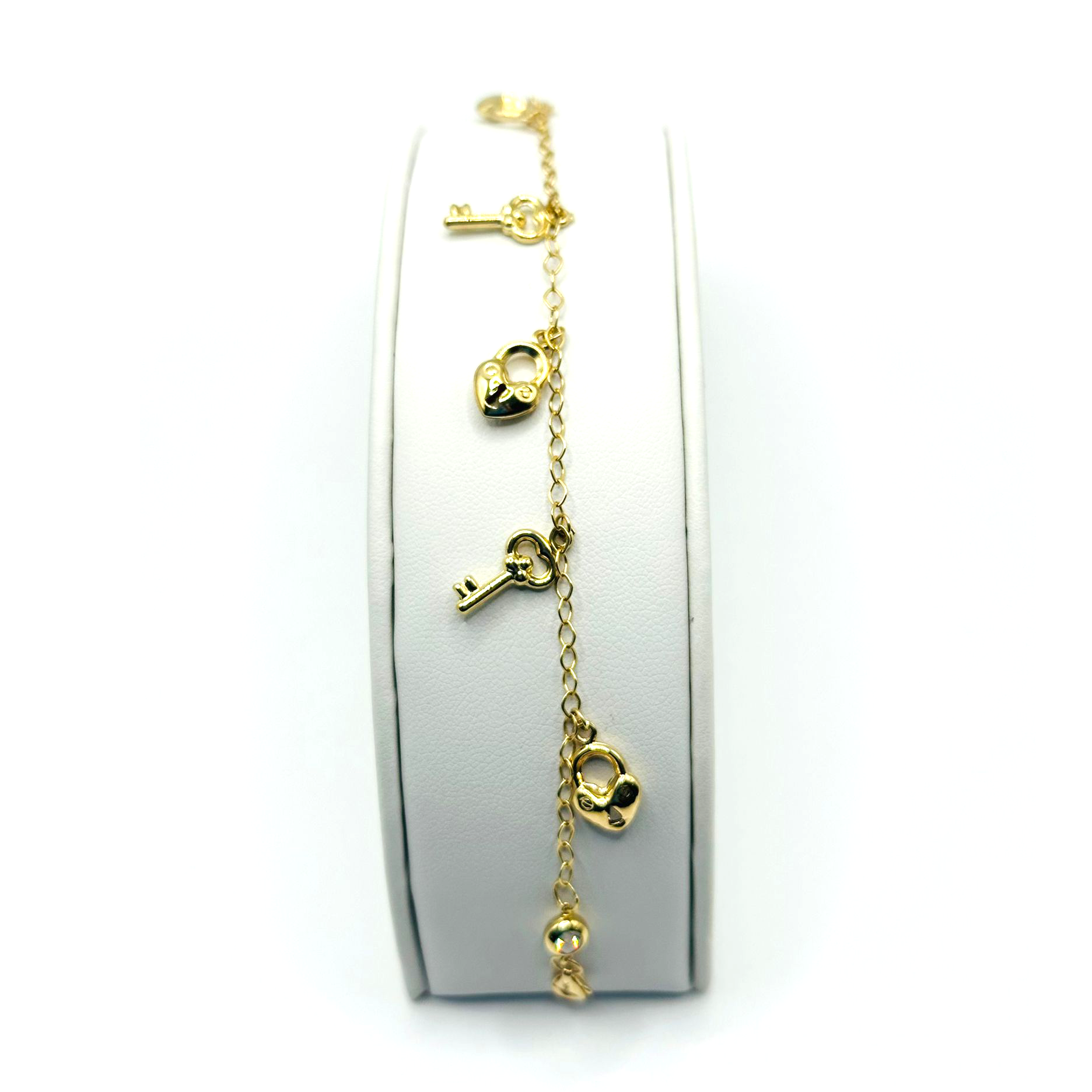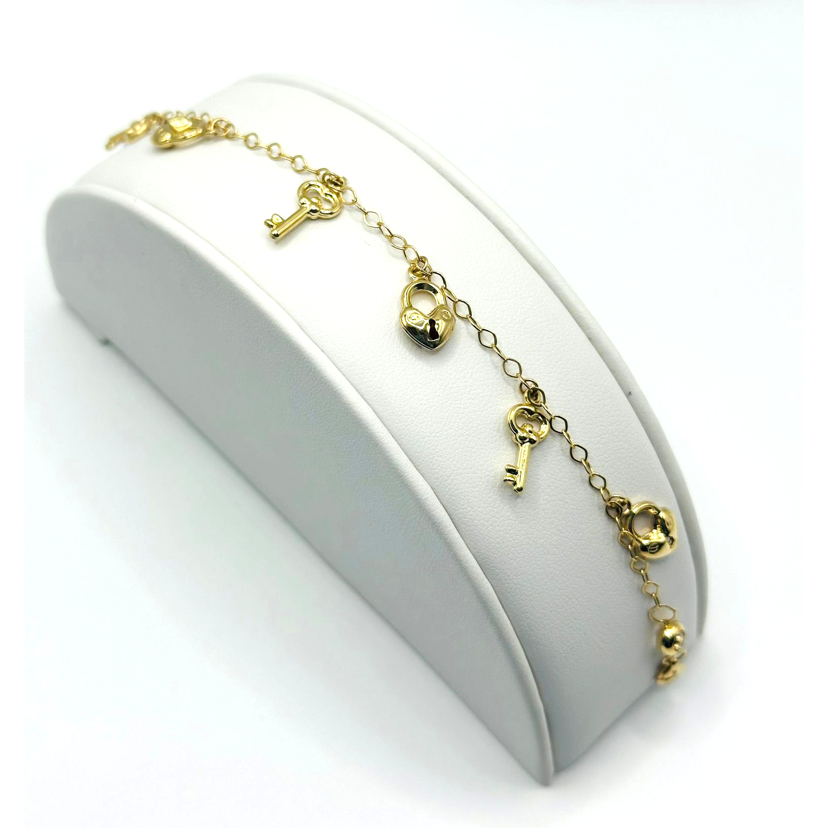 This Keys and Hearts Bracelet in 14K gold expertly blends symbolic design with refined elegance. Meticulously crafted, it features delicate key and heart motifs that convey themes of love and unlocking potential. With its high-quality 14K gold construction, the bracelet offers durability and a radiant finish, making it an exceptional accessory for sophisticated everyday wear or special occasions.