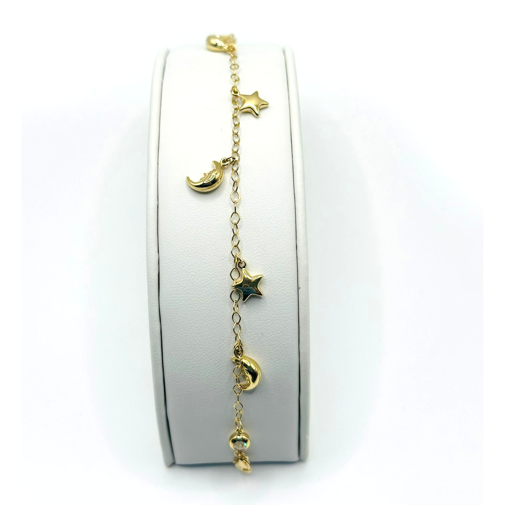 Crafted in luminous 14K gold, the Moon and Stars Bracelet offers a refined balance of celestial elegance and everyday wearability. This delicately designed piece features subtle moon and star motifs that bring a timeless yet modern charm, enhancing both casual and formal ensembles. Its durable construction ensures lasting shine and comfort, making it a sophisticated choice for those who appreciate expert craftsmanship and symbolic detailing.